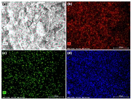 Figure 3a–d illustrates the selected area in the SEM micrograph along with elemental mappings of the Fe3O4/FeOOH/CeO2 composite synthesized with a Ce:Fe molar ratio of 1:15. The results clearly indicate the presence of iron (Fe), cerium (Ce) and oxygen (O) elements, with no observable aggregation, suggesting that these elements were uniformly dispersed throughout the composite. Furthermore, EDS analysis estimated the atomic ratio of Ce:Fe to be approximately 1:16.6, which was in close agreement with the theoretical value based on the starting materials used (Ce(NO3)3∙6H2O and FeCl2∙4H2O) during synthesis at a Ce:Fe molar ratio of 1:15.