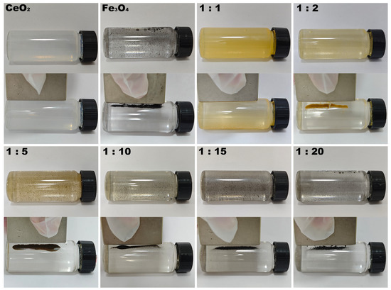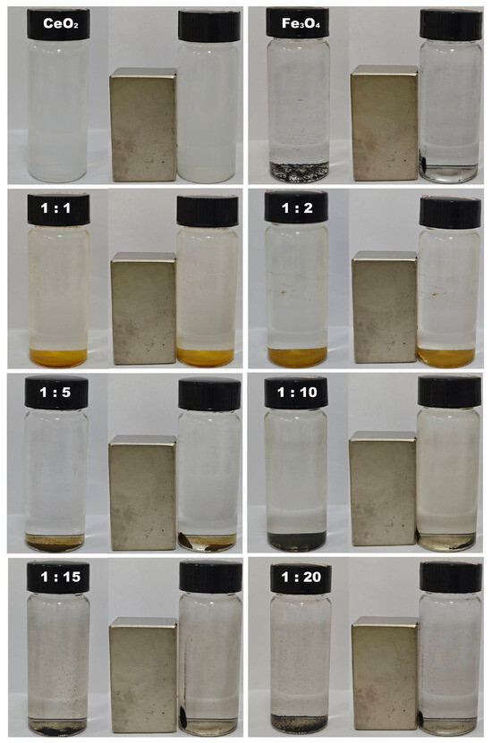 In practical applications, it is crucial for the adsorbent or catalyst to possess magnetic sensitivity and exhibit rapid responsiveness when subjected to an applied magnetic field. This characteristic would facilitate their rapid recovery and sustainable removal and regeneration. To investigate the influence of the Ce:Fe molar ratios on the magnetic sensitivity, the magnetic response behaviors of the composites were examined in the water medium using a Nd–Fe–B magnet. Figure 4 shows the suspension after 30 min of ultrasonic dispersion followed by 24 h of settling (left), alongside the outcome of a subsequent result of 2 min magnetic separation (right). From the left vial without a magnet, it was observed that after standing for 24 h, all solid samples settled to the bottom of the vial, resulting in transparent supernatants. However, exceptions were noted for the two composites synthesized with Ce:Fe molar ratios of 1:15 and 1:20, where some black particles were visibly present in their liquid phase. Upon placing a magnet on the left side of the vial, it was observed that some of the solid particles were attracted to the side near the magnet, except for the reference CeO2 and the composite synthesized with a Ce:Fe molar ratio of 1:1. Furthermore, after adding the magnet, black particles in the supernatant were attracted to its side and became clear for both composites synthesized with Ce:Fe molar ratios of 1:15 and 1:20.
