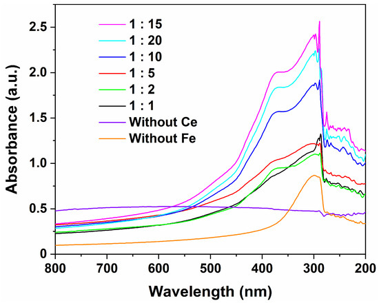 The light absorption properties of the as-prepared samples were investigated through UV–VIS absorption analysis, and the results are presented in Figure 6. As observed, the CeO2 reference sample synthesized without Fe exhibited initial absorption around 700 nm, with the most intense absorption occurring in the UV region at approximately 300 nm. Interestingly, the Fe3O4 reference sample synthesized without Ce demonstrated strong absorption starting at about 800 nm; however, its intensity decreased slightly thereafter, showing minimal variation in both UV and VIS regions. For the synthesized hybrid Fe3O4/FeOOH/CeO2 complex catalyst, a notable initial absorption was also recorded at around 800 nm, but lower than that of the Fe3O4 reference sample. The first maximum absorption peak was reached at approximately 400 nm, followed by a second maximum peak near 300 nm. Notably, optimal catalytic performance was achieved when the Ce:Fe molar ratio was set to 1:15. The order of absorption strength observed was as follows: 1:15 > 1:20 > 1:10 > 1:5 > 1:2 > 1:1. Moreover, the hybrid Fe3O4/FeOOH/CeO2 complex catalyst exhibited varying degrees of red-shifted absorption when compared to the CeO2 reference sample. This observation served as an indication of the formation of the nano-hybrid structure. The enhanced visible light absorption was likely to have a positive impact on the photocatalytic performance of the hybrid Fe3O4/FeOOH/CeO2 catalysts.