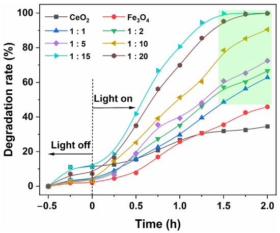 The adsorptive degradation in darkness and photocatalytic degradation under UV illumination of AO7 using Fe3O4/FeOOH/CeO2 composites synthesized with Ce:Fe molar ratios of 1:1, 1:2, 1:5, 1:10, 1:15 and 1:20 were measured and compared to those of CeO2 and Fe3O4, as shown in Figure 7. For the adsorption of AO7 in the dark, all samples reached adsorption–desorption equilibrium within 15 min of reaction. Moreover, two reference samples of CeO2 and Fe3O4 exhibited the lowest degradation rates in the dark with values recorded at 2.0% and 11.3% at a period of 30 min, respectively. After the initiation of UV radiation, the degradation rate of AO7 in all samples exhibited a significant increase. Specifically, the degradation rates for CeO2 and Fe3O4 were 34.6% and 45.9% after 2 h, respectively. Fe3O4/FeOOH/CeO2 composites synthesized with different Ce:Fe molar ratios exhibited showed superior photocatalytic activity against AO7. If the Ce:Fe molar ratio was 1:1, 1:2 and 1:5, the degradation rates of AO7 in the resultant products were 62.8%, 66.7% and 72.5% in 2 h, respectively. When a higher Ce:Fe molar ratio of 1:10 was employed, the degradation rate of the as-obtained composite was 90.5%. When the Ce:Fe molar ratio was increased to 1:15 and 1:20, the Fe3O4/FeOOH/CeO2 products had the highest photocatalytic activity towards AO7, and could achieve almost 100% degradation. The enhanced photocatalytic activity of the Fe3O4/FeOOH/CeO2 composites could be attributed to the synergistic effects occurring at the three interfaces. By comparing the degradation rates of all composites after 1.5 h, it was observed that the photocatalytic activity of AO7 reached its optimal level when the Ce:Fe ratio was 1:15, resulting in nearly 100% degradation within this reaction time.