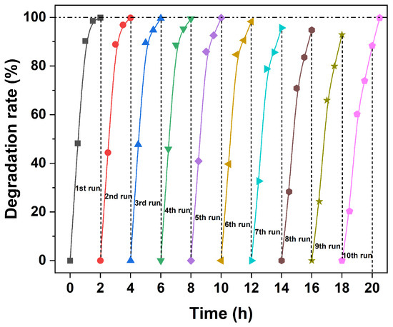 The stability of catalysts in solid–liquid reactions is a crucial performance and economic indicator for practical applications. Consequently, the reusability of the Fe3O4/FeOOH/CeO2 composites synthesized with Ce:Fe molar ratio of 1:15 was evaluated. As shown in Figure 8, during the initial five cycles of cyclic photocatalysis, the degradation rate of AO7 remained nearly 100%. There was a slight decrease in the degradation rate from the sixth photocatalytic cycle; however, it still reached 88.4% by the conclusion of the tenth cycle. Notably, near-complete degradation could be achieved by extending the UV irradiation time by an additional 30 min. The results depicted in Figure 8 demonstrate the exceptional stability of the Fe3O4/FeOOH/CeO2 catalyst.