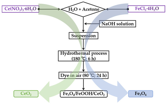Magnetic complex catalysts were synthesized by a hydrothermal method without a subsequent calcination process, and the schematic representation is illustrated in Scheme 1. Typically, the desired amounts of Ce(NO3)3∙6H2O and FeCl2·4H2O with different molar ratios of Ce:Fe (1:1, 1:2, 1:5, 1:10, 1:15 and 1:20) were dissolved in a mixed solution of purified water (12 mL) and acetone (13 mL) by magnetic stirring; the total amount of Ce3+ and Fe2+ ions was 1.0 mmol. Then, 4 mL NaOH aqueous solution (1 mol/L) was added drop by drop over 15 min of continuous stirring. Subsequently, the above mixed solution was sealed into a 50 mL Teflon-lined stainless steel autoclave and heated at 180 °C for 6 h. After the hydrothermal reaction, the system was allowed to cool naturally to room temperature, the resulting precipitates were then collected and washed with purified water followed by ethanol. Finally, a series of composite powders with different molar ratios of Ce:Fe was obtained after drying in air at 80 °C for 24 h.