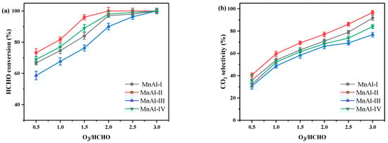 To study the catalytic ozonation performance of the prepared MnAl catalysts, activity tests were conducted and the results are shown in Figure 1a. The ratio of O3/HCHO was set from 0.5 to 3.0, and the theoretical equivalent of O3/HCHO for complete oxidation is 2, as presented in Equation (1). Apparently, the conversion of HCHO improved with the increase of the O3/HCHO ratio, suggesting that more O3 input could promote the process of catalytic reaction. MnAl-II showed the best HCHO catalytic activity, which achieved nearly 100% HCHO conversion at an O3/HCHO ratio of 2.0 and reached above 95% HCHO conversion at an O3/HCHO ratio of 1.5. In general, the O3/HCHO ratio corresponding to 90% HCHO conversion (O90) increased in the following order: MnAl-II (1.3) < MnAl-IV (1.5) < MnAl-I (1.7) < MnAl-III (2.0). Across the whole range of the ozone input, there was almost no O3 residual for all the catalysts. A comparison of the catalyst researched in this work with previously published catalysts for HCHO ozonation is summarized in Table 1.