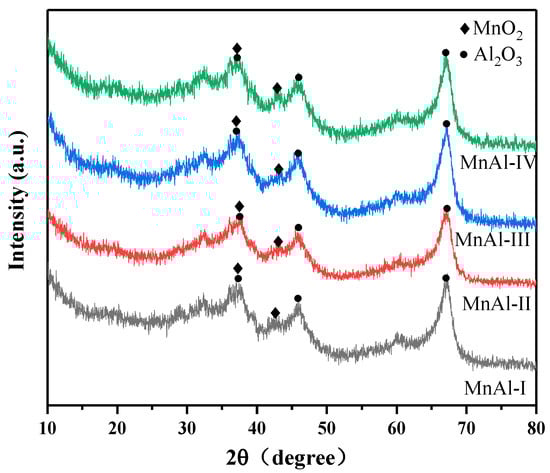 As shown in Figure 2, the XRD patterns presented the crystalline structures of the synthesized catalysts, which had similar characteristic diffraction peaks. The peaks at 37.6°, 45.8°, and 66.8° were ascribed to the (3 1 1), (4 0 0), and (4 4 0) planes of γ-Al2O3 (PDF#29-0063), while the peaks appearing at 37.3° and 42.8° should be ascribed to the (1 0 1) and (1 1 1) planes of α-MnO2 (PDF#24-0735) [6]. Obviously, the intensity of the MnAl-II catalyst was weaker than the other three catalysts, indicating its better metal dispersion and smaller metal particle size.