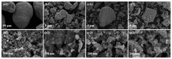 SEM images of (a1,a2) MnAl-I, (b1,b2) MnAl-II, (c1,c2) MnAl-III, and (d1,d2) MnAl-IV.