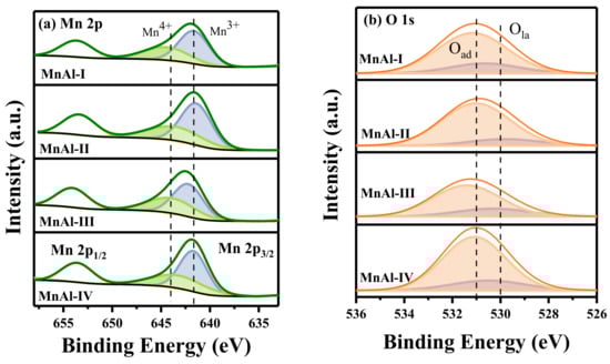 To evaluate the surface properties of the catalysts, the deconvoluted results of XPS spectra are presented in Figure 4, and the contents of the Mn and O species with different oxidation states are tabulated in Table 3. As shown in Figure 4a, the Mn 2p3/2 spectrum consisted of two peaks at ~642 eV and 643 eV, ascribed to the Mn3+ and Mn4+ species, respectively. Clearly, Mn3+ was the main Mn species, and the order of the Mn3+/Mn4+ molar ratio was as follows: MnAl-II (1.65) > MnAl-I (1.64) > MnAl-IV (1.57) > MnAl-III (1.36). In general, Mn3+ usually triggers the Jahn–Teller distortion, and to preserve the electrostatic balance, oxygen vacancies are accordingly generated in the process (Equation (2), Vo refers to a oxygen vacancy). Moreover, as reactive sites, more oxygen vacancies are beneficial for O3 decomposition and HCHO ozonation [28,29].