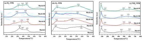 The redox ability of the synthesized catalysts was revealed by the H2-TPR profiles, as shown in Figure 5a. The catalysts exhibited typical reduction peaks, which could be assigned to the successive reduction process of MnO2 (IV) → Mn2O3 (III) → Mn3O4 (II and III) → MnO (II) [31]. By contrast, MnAl-II appeared at a lower H2 reduction temperature, at 236 °C, showing an excellent reducibility at a low temperature [7]. As the report goes, a higher H2 uptake amount always contributes to a better redox ability [32]. However, the amount of H2 uptake (Table 4) increased in the following order: MnAl-I (4.03 mmol·gcat−1) < MnAl-II (4.05 mmol·gcat−1) < MnAl-IV (5.15 mmol·gcat−1) < MnAl-III (5.28 mmol·gcat−1), inconsistent with the results of the removal efficiency. It demonstrated that there may be no positive correlation between the H2 uptake amount and catalytic ozonation activity.
