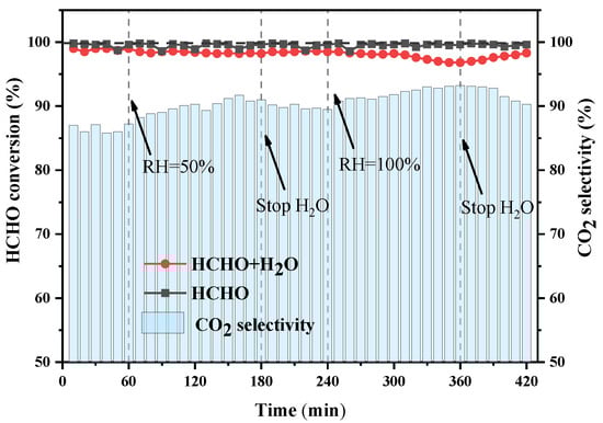 As water vapor commonly exists in indoor air, it may influence catalytic performance and activity. Thus, a long-term H2O resistance test was carried out on MnAl-II to study the effect of H2O on its excellent performance in the activity tests. The reaction temperature was 30 °C, and the molar ratio of O3/HCHO was set as 2.5. As depicted in Figure 6, in the stability test, the conversion of HCHO was maintained at ~99% for 7 h, demonstrating the favorable stability of MnAl-II. When RH = 50%, a slight drop in HCHO conversion was caused, falling from ~99% to ~98% after 2 h. When the H2O was stopped, the conversion of HCHO gradually recovered to ~99%. Subsequently, when RH = 100%, the HCHO conversion decreased to ~97% and then recovered to ~98% after stopping H2O. Obviously, the effect of H2O was negligible, and the slight deactivation was fortunately reversible. Moreover, the presence of H2O promoted the selectivity of CO2; this may be because the generated OH active radicals were beneficial to the complete oxidation of HCHO to CO2 [38].