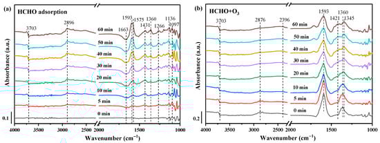 To study the transformation of intermediate species, in situ DRIFTS experiments were performed to reveal the possible reaction mechanism of HCHO ozonation over the MnAl-II catalyst. Initially, the process of HCHO adsorption at 30 °C (with N2 as a background gas) was investigated, as recorded in Figure 7a. Notably, the peak located at 2896 cm−1 could be ascribed to the C–H stretching of adsorbed HCHO, while the bands at 1431, 1136, and 1097 cm−1 corresponded to dioxymethylene (DOM) species [39,40]. The absorbance bands centered at 1266, 1360, 1575, and 1593 cm−1 were related to the symmetric and asymmetric stretching vibration of formate species [41]. Additionally, the peaks at 1663 and 3703 cm−1, which could be designated to adsorbed water and hydroxyl groups on the catalyst surface, decreased to negative peaks, possibly due to the consumption of OH species during the adsorption process [42,43].