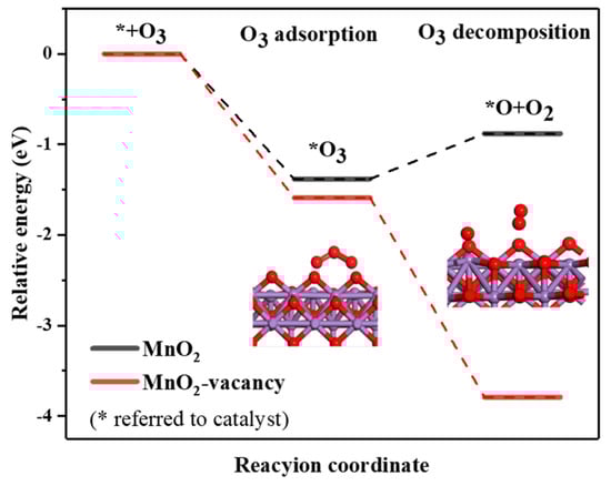Vital to the O3 decomposition and ozonation process, the effect of oxygen vacancies on the catalytic reaction was further researched through theoretical calculations. As the main reaction sites for O3, the calculations were carried out on a α-MnO2 (1 0 0) surface. As depicted in Figure 8, the adsorption energy of an O3 molecule on α-MnO2 with an oxygen vacancy (Eads = −1.59 eV) was lower than the original one (Eads = −1.38 eV). Generally, a lower adsorption energy illustrated a stronger interaction between O3 and the α-MnO2 surface, meaning that oxygen vacancies facilitated the adsorption of O3 [45]. Next, with the elongation of the O–O bond, O3 was decomposed into *O and O2. For α-MnO2 with an oxygen vacancy, the energy change for O3 decomposition was −2.20 eV, proving to be an exothermic reaction, which was thermodynamically favorable and spontaneously occurred. As for the original α-MnO2, the required energy change to overcome the energy barrier was 0.50 eV, limiting the reaction rate. Therefore, the generation of oxygen vacancies greatly enhanced the adsorption and decomposition of O3, accelerating the speed of catalytic ozonation.