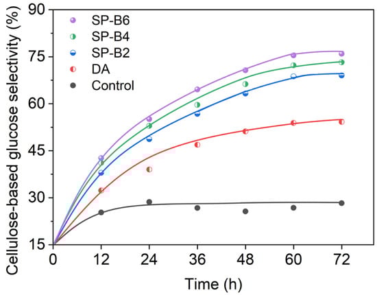 To understand the chemical conversion capacity of the pretreated stalks, their enzymatic hydrolysis properties were characterized. As expected, Figure 2 shows that cellulose-based glucose selectivity of untreated tobacco stalks (the control) was the lowest, with a value of only around 26.8%. This is attributed to the inherent resistance of the lignocellulose. After pretreatment, there is a noticeable trend of increased glucose production. Notably, when enzymatic hydrolysis is carried out for 60 h, the saccharification approaches saturation, suggesting that the sample has undergone nearly complete conversion of its glucose content. Comparing samples treated with different amounts of sodium sulfite, when the amount of sodium sulfite increased from 0% to 6%, the glucose selectivity increased from 54.2% to 75.9% after 72 h of reaction. With the increase in the dosage of the sulfonating agent during pretreatment, the enzymatic hydrolysis activity of the treated tobacco stalks was significantly enhanced, which could be attributed to the destruction of the intact cell wall structure and the delignification. Compared to previous studies based on pretreatment with SPROL, the cellulose-based glucose selectivity in this study is higher than that of hardwood (e.g., aspen, 2% NaHSO3) and softwood (e.g., pine, 8% NaHSO3), with glucose selectivities of around 50~60% [28,29]. This is also comparable to corn stalks, which have glucose selectivities of about 80% [30]. In addition, the result is also similar to those from NaOH-treated tobacco stalks (69.0%) [31].