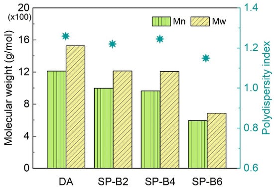 The molecular weight and distribution of lignin are important structural characteristics that affect its properties and reactivity. Figure 3 and Supplementary File Table S1 displays the Mw, Mn, and polydispersity index (where Mw is the mass-weighted molecular weight, Mn is the polymer chain number weighed molecular weight, and PDI = Mw/Mn, which is a measure of the broadness of the molecular weight distribution; the larger the PDI, the broader the molecular weight) of the lignin analyzed through GPC. For example, the Mw and Mn of the lignin resulting from the enzymatic hydrolysis of sample SP-B6 are 686 and 595 g/mol, respectively, with a PDI of 1.15. Figure 3 shows a slight decrease in Mw and Mn values with an increase in the content of sodium bisulfite during pretreatment, which is mainly due to the increase in the dosage of sulfonation agent (NaHSO3) during the SPROL pretreatment process, leading to the breakage of molecular chains. The smaller the PDI, the narrower the molecular weight distribution, which means the obtained lignin is more uniform and favorable for utilization.