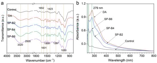The fingerprint region of the FT-IR spectra of different isolated tobacco stalk lignin after the enzymolysis step are shown in Figure 4a, where typical lignin bands are observed. Similarly to the original lignin from tobacco stalks (the control), the lignin extracted after the enzymolysis of the sulfite treated stalks exhibits typical characteristics of grass lignin including the benzene ring vibrations of the phenylpropane skeleton at 1601, 1509, and 1423 cm−1, as the intensity increased after the pretreatment [32]. Compared with the control lignin, the lignin treated through the SPROL process also exhibit new absorption peaks at 1050 and 1267 cm−1 assigned to sulfonic acid groups and whose intensity increased with the dosage of NaHSO3, indicating that the lignin was sulfonated [33]. Another significant difference is observed at 1652 cm−1, which is attributed to the conjugated carbonyl groups (C=O stretching vibration) during the sulfonation process [34].