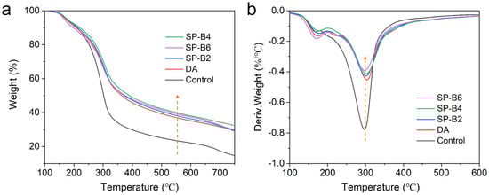 The thermal stability of lignin is crucial for probing into its subsequent pyrolysis conversion [36]. Therefore, thermogravimetric analysis (TGA), which can reflect the thermal information of lignin in a straightforward manner, was applied to analyze all of the lignin samples [37,38]. Figure 5 shows the TG/DTG curves of all the studied lignin. The thermal decomposition process of the isolated lignin can be segmented into three stages. Firstly, some lower peaks at the temperature between 100 °C and 250 °C were observed, owing to the degradation of the weak or labile linkages in the residual polysaccharides and small fragments of lignin molecules. When the temperature increased up to 250~400 °C, severe mass loss occurred, which could be attributed to the cleavage of β-O-4 and α-O-4 and the side chain oxidation of lignin, and simple substituted aryl compounds released [39]. The third stage occurs when the temperature is further elevated to above 400 °C, at which the rate of weight change slows down. This process involves the cleavage of the C-C bond (5-5) in the lignin interior, and aromatic rings which collapsed and sedimented into residual char. Furthermore, the shedding of methoxy (OCH3) can also occur, and methane is released at this stage [40]. It was found that the DA lignin showed better thermal stability compared with other lignin samples. The maximum weight loss rate of DA lignin was at 304 °C, while the maximum weight loss rate of SPROL lignin samples was at 296~301 °C, indicating that as the dosage of sulfonating agent increased, the maximum weight loss temperature of lignin decreased. Moreover, compared with the control lignin, the lignin after pretreatment shows higher thermal stability as well as more pyrolytic residue, which could be due to its high purity.