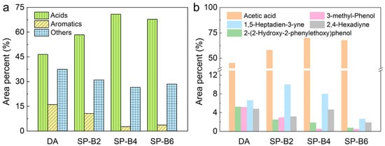 As is shown in Figure 6 and Supplementary File Table S2, the main detectable components of bio-oil obtained from lignin pyrolysis are acid (e.g., acetic acid), aromatic derivatives (e.g., phenol, 3-methyl-phenol, etc.), and aliphatic hydrocarbon (1,5-Heptadien-3-yne, 2,4-Hexadiyne, etc.). Acetic acid is the most abundant identified GC-MS component and the proportions of acetic acid content are 45.27 wt.%, 57.93 wt.%, 69.91 wt.%, and 67.64 wt.% for DA, SP-B2, SP-B4, and SP-B6 lignin pyrolysis identifiable oil, respectively. The main source of acetic acid could be from the breakdown of the acetyl group in the hemicellulose, the further degradation of unhydrolyzed carbohydrates, or the cleavage of the Cα-Cβ bond in the alkyl side chain of lignin units with the –CH2OH or –COOH structure at the γ position [44,45]. The most abundant monomeric aromatic are 2-(2-Hydroxy-2-phenylethoxy)phenol and 3-methyl-phenol, which could be attributed to the stabilization process of the cracked radicals of Cβ-O and Cα-O [46]. The generation of aliphatic hydrocarbons that contain two double bonds, such as 2,4-Hexadiyne and 1,5-Heptadien-3-yne, is attributable to the aromatic ring’s propensity for undergoing ring-opening reactions and the secondary reaction of furans, propargyl, and monocyclic aromatic hydrocarbons at high temperatures [47]. The high acetic acid content enabled the bio-oil to further separate into bio tar and pyroligneous acid (a dark liquid produced through the destructive distillation of wood and other plant materials; it mainly contains acetic acid, and acetone), which have been widely applied in the food industry, agriculture, and the horticultural field [48,49]. Taken together, these results show that tobacco stock pretreated at SP-B4 or SP-B6 would be the ideal conditions for its comprehensive utilization, which ensures that the pretreated tobacco stock has high enzymatic hydrolysis efficiency while realizing high value utilization of lignin for pyroligneous acid and wood tar.