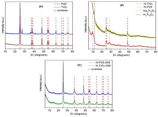 After the calcination of the hydrothermally treated samples, it was observed that the tetragonal phase of TiO2 (JCPDS 21-1272) is formed. As shown in Figure 1C, both diffractograms of N-P25-400 and N-TiO2-400 present the characteristic peak of the (101) plane for the anatase phase located at 2θ = 25.28° as well as the rest of the signals attributed to this crystalline phase. It can be assumed that after the calcination of the dried nanostructures, the anatase crystalline phase of TiO2 is recovered for both samples. The N-P25-400 did not show any peak related to the presence of the rutile phase after the hydrothermal treatment and further calcination.