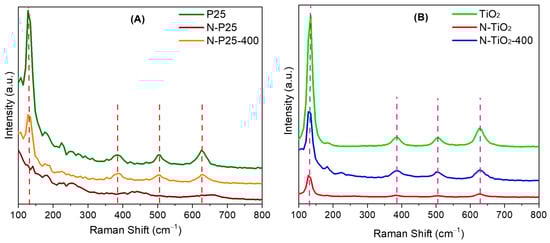 Additional information that completes the structural information obtained by X-ray diffraction can be obtained from Raman spectroscopy. Figure 2A shows the Raman spectra of P25-derived samples, where the characteristic signals of the anatase phase are observed with bands at 130 (B1g), 383 (B1g), 503 (Eg), and 627 (Eg) cm−1; however, these signals are more intense for the P25 and N-P25-400 samples, indicating higher crystallinity for those than for N-P25. Moreover, for P25, additional low intense bands can be observed due to the presence of the rutile crystalline phase, since this sample is formed by rutile and anatase phases, which agrees with the presence of small peaks assigned to these phases by XRD. It is noticed that the absence of such signals in the N-P25 corresponding Raman spectrum attributed to the presence of different crystalline structures for the N-P25 sample, which comprises a mixture of sodium and hydrogen titanates as observed by XRD.