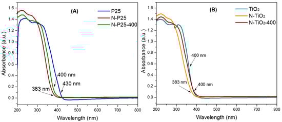 According to the literature, one of the main reasons for modifying TiO2 relies on the enhancement of its optical properties. In this sense, slight changes in its crystalline structure modify the band gap energy (Eg). For instance, anatase and rutile, the most common polymorphs of TiO2, have 3.20 and 3.02 eV, respectively [36], and larger changes can be induced by doping and/or combining them with other semiconductors, polymers, or dyes [37,38]. Figure 3A shows the UV-Vis spectra of the nanomaterials derived from P25. The corresponding electronic transitions of O2− (2p) and Ti4+ (3d) from TiO2 are displayed as the pronounced edge at 430 nm for the P25 nanomaterial indicates, whereas a slight variation is observed in the absorption band of N-P25 and N-P25-400. After the hydrothermal treatment, the spectrum of the sample exhibits a shift towards a lower wavelength (383 nm), but once the nanomaterial was calcined at 400 °C, the edge was shifted toward 400 nm.