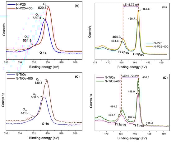 Highly resolved X-ray photoelectron spectra for the nanomaterials prepared. (A,B) correspond with P25, and (C,D) correspond with TiO2 sol–gel-derived materials.