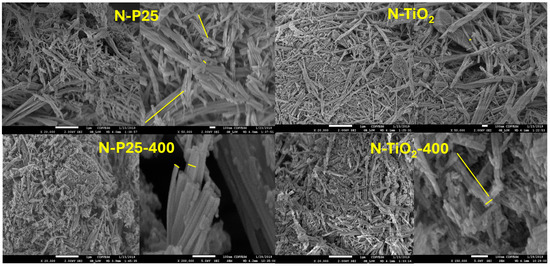 From the microscopic analysis, it is observed that the particles of all samples are a nanorod-like shape (Figure 5). For dried and calcined samples, particles with lengths between 100 and 900 nm and diameters of approximately 10 nm were observed. It can be noticed that for the samples calcined at 400 (N-P25-400 and N-TiO2-400), a loss of the tubular structure is observed, as the presence of small, rounded particles indicates. In addition, due to the calcination process, nanorods begin to form agglomerates with lengths of approximately 600 nm.