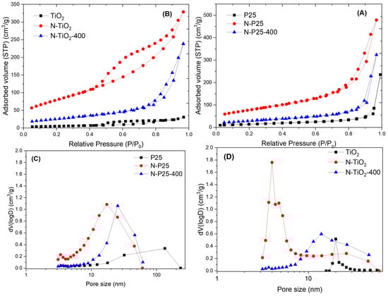 To evaluate additional changes and differences in porosity among the prepared samples, pore size distributions (PSDs) were plotted considering adsorption data and the BJH (Barrett–Joyner–Halenda) method. Figure 6C shows the PSD for the P25-derived samples, where it can be observed that N-P25 and N-P25-400 exhibited a similar distribution to each other, ranging from 2 to 60 nm, and had almost the same pore volume. In contrast, the N-TiO2-400 photocatalyst showed a significant decrease in its pore volume and the shape of its distribution, resembling that observed for TiO2, but was less homogeneous in size and had a larger number of pores.
