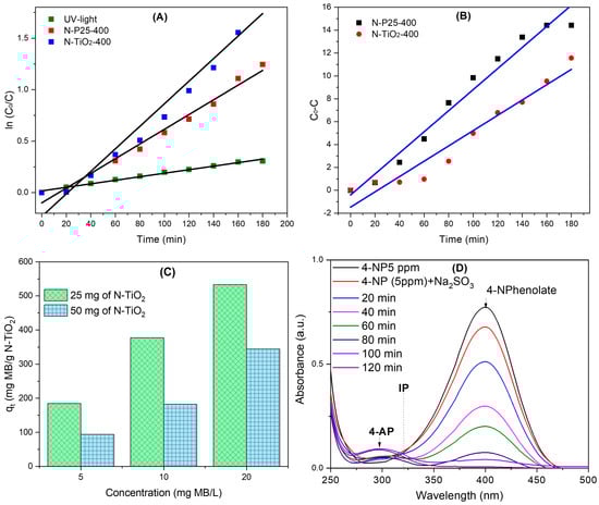 (A) Kinetic profiles for the degradation of the 20 ppm methyl orange solution adjusting to first-order kinetics, and (B) kinetic profiles for the degradation of the 20 ppm phenol solution adjusted to zero-order kinetics under UV light (λ = 254 nm); (C) the adsorption capacity of N-TiO2 for different concentrations of methylene blue (MB) after 60 min in the dark; the (D) photoreduction of 4-Nitrophenol with the N-TiO2-400 photocatalyst under UV light (λ = 254 nm).