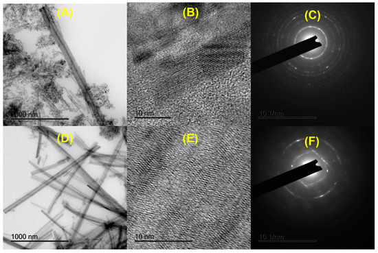 HRTEM images for the (A,B) N-TiO2 and (D,E) N-TiO2-400 photocatalysts (C,F) represent the selected area electron diffraction (SAED) patterns of the N-TiO2 and N-TiO2-400, respectively.