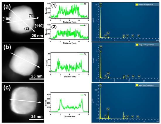 The line scanning results of Pd/Pt0.02, Pd/Pt0.025, and Pd/Pt0.05 nanocrystals lying flat on the TEM copper grid are shown in Figure 4, where the scanning paths are consistent with the directions of the arrows shown in the HAADF-STEM images. When the scanning direction is along the [100] direction of the fcc metal, as path (1) shown in Figure 4a, the platinum content has a peak on each of the two outer facets of the nanocrystal, which demonstrates that platinum is mainly distributed on the {100} facets of the nanocrystal []. When the scanning direction is along the [110] direction of the fcc metal, as path (2) shown in Figure 4a, the distribution of platinum along the scanning path is relatively uniform, and the signal intensity of platinum at the corners is basically the same as that on the crystal facets, indicating that the platinum element is not preferentially deposited at the corners of the nanocrystals. This may be due to the low concentration of the platinum precursor and high reaction temperature in our synthetic process, which leads to a slower atom deposition rate and faster surface diffusion of platinum [,]. Consequently, platinum is not deposited at the corners to make the nanocrystals develop into a concave polyhedral structure but is relatively uniformly deposited on the surface of palladium nanocrystals to maintain the shape of the truncated nanocube. When the scanning direction is along the [100] direction, with an increase in the Pt/Pd ratio in the truncated nanocube catalysts, the peak on each of the two outer facets in Pd/Pt0.025 and Pd/Pt0.05 catalysts gradually increased, indicating an increase in the platinum content on the {100} facets of the Pd/Pt nanocrystals.
