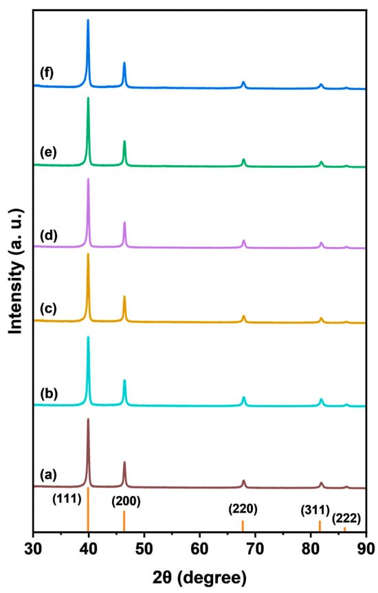 XRD patterns of (a) Pd/Pt0.005, (b) Pd/Pt0.01, (c) Pd/Pt0.015, (d) Pd/Pt0.02, (e) Pd/Pt0.025, and (f) Pd/Pt0.05 catalysts. The vertical bar is the JCPDS card data of monometallic Pd (No. 87-0643).