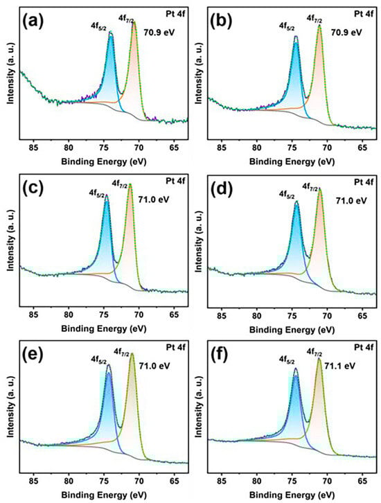 To study the electronic states of Pd and Pt species in all the bimetallic Pd/Pt catalysts, XPS tests were performed. Figure 7 shows the Pt 4f XPS spectra of all the bimetallic Pd/Pt catalysts. The XPS spectra of platinum in the bimetallic Pd/Pt catalysts are fitted with two peaks with an area ratio of 4:3 and binding energies of 70.9 and 74.2 eV, respectively, which are attributed to the Pt 4f7/2 and Pt 4f5/2 peaks, respectively (Table S1). As for the Pd/Pt0.005 and Pd/Pt0.01 catalysts, their binding energies of Pt 4f7/2 are slightly lower than that of the standard value (71.0 eV), which may be owing to the partial charge transfer from palladium to platinum [,]. With a gradual increase in the platinum content, the binding energy of Pt 4f7/2 increases from 70.9 eV to 71.1 eV, which is slightly higher than the standard binding energy value of platinum. The binding energy of platinum increases with an increase in the theoretical thickness of the platinum layer, suggesting that the electron-donating effect of palladium gradually weakens with an increase in the platinum thickness, which is consistent with the previously reported results []. The contents of platinum in the Pd/Pt0.005 and Pd/Pt0.01 catalysts are less than one monolayer, so the electron donation from Pd to Pt is the most obvious, resulting in a decrease in the binding energy of platinum compared to the monometallic platinum. In contrast, the theoretical thickness of platinum on the Pd/Pt0.05 nanocrystals is 3.3 atomic layers, and therefore it is the least affected by the metal palladium in the nanocrystal. The theoretical thicknesses of platinum on Pd/Pt0.02 and Pd/Pt0.025 nanocrystals are 1.3 and 1.7 atomic layers, respectively. Thus, the binding energies of Pt 4f7/2 in Pd/Pt0.02 and Pd/Pt0.025 catalysts are 71.0 eV, which is located in the middle of 70.9 and 71.1 eV.