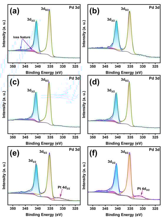 The Pd 3d XPS spectra of Pd/Pt0.005, Pd/Pt0.01, Pd/Pt0.015, Pd/Pt0.02, Pd/Pt0.025, and Pd/Pt0.05 catalysts are exhibited in Figure 8. The Pd 3d XPS spectra can be fitted with two main asymmetric peaks, corresponding to the Pd 3d5/2 and Pd 3d3/2 peaks of palladium with an area ratio of 3:2 (Table S2). The other two peaks with higher binding energies are attributed to the energy loss peaks of palladium [,]. The binding energies of Pd 3d5/2 in all the bimetallic Pd/Pt catalysts are basically the same (~335.3 eV) and slightly higher than the standard value of metallic palladium (335.1 eV). The increase in palladium binding energy may be ascribed to the transfer of some electrons from palladium to platinum and the inevitable air exposure during the XPS tests []. When the molar ratio of Pt/Pd is larger than 0.025 and the theoretical thickness of the platinum layer in Pd/Pt bimetallic nanocrystals is larger than 1.7 atomic layers, another peak with a lower binding energy of 331.7 eV can be observed, which is assigned as the Pt 4d3/2 peak. When the molar ratio of Pt/Pd is less than 0.02 and the theoretical thickness of the platinum layer is less than 1.3 atomic layers, the peak of Pt 4d3/2 is not observed. The Pt 4f and Pd 3d XPS spectra demonstrate that the binding energies of palladium in the bimetallic Pd/Pt truncated nanocube catalysts are basically the same, while the binding energies of platinum gradually increase with an increase in the platinum content. This clearly demonstrates that there is an electronic interaction between palladium and platinum in the bimetallic Pd/Pt truncated nanocube catalysts and this electronic effect is closely related to the thickness of the platinum layer.