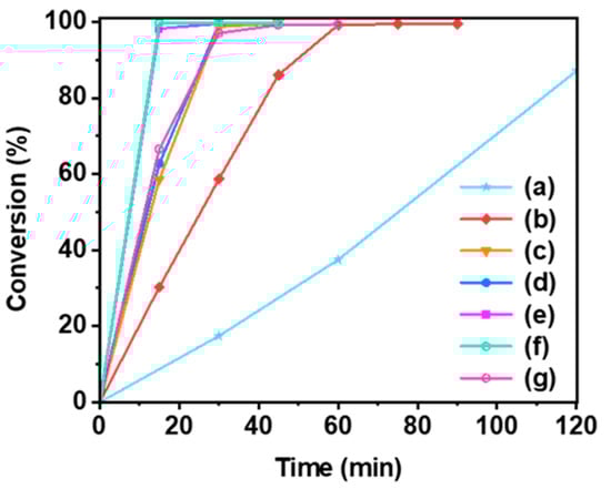 Conversion of acetophenone as a function of reaction time, (a) Pdtrunc-cube, (b) Pd/Pt0.005, (c) Pd/Pt0.01, (d) Pd/Pt0.015, (e) Pd/Pt0.02, (f) Pd/Pt0.025, and (g) Pd/Pt0.05 catalysts. Reaction conditions: 4 mg of catalyst, 17 mL of methanol, 20 μL of acetophenone, 288 K, atmospheric pressure, hydrogen flow rate 60 mL·min−1.