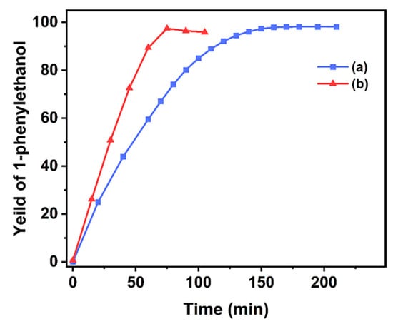 (a) The yield of 1-phenylethanol in the selective hydrogenation of acetophenone over Pd/Pt0.025 and (b) Pd/Pt0.02 catalysts as a function of reaction time. Reaction conditions: 4 mg of catalyst, 17 mL of methanol, 500 μL of acetophenone, reaction temperature 288 K, hydrogen flow rate 60 mL·min−1.