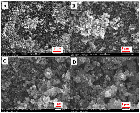 SEM images of the synthesized Ag/TiO2 at different magnifications: (A) 1.5 KX; (B) 3.0 KX; (C) 10 KX; and (D) 14 KX.