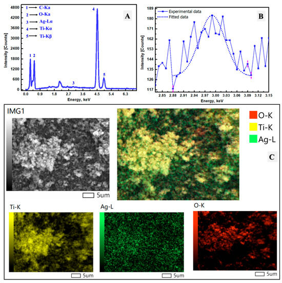 (A) EDX analysis of the prepared Ag/TiO2, (B) EDX analysis with focus on the Ag area of Ag/TiO2, and (C) elemental mapping of Ag/TiO2, including the map of Ti, O, and Ag.