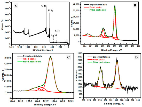 (A) Total survey of XPS analysis, (B) Ti-2p XPS fine-fitting analysis, (C) O-1s XPS fine-fitting analysis, and (D) Ag-3d XPS fine-fitting analysis.