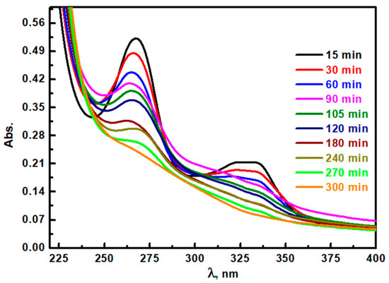 The degradation of CIP in aqueous media at different times up to 300 min was studied via UV-visible spectroscopy (Figure 8). CIP’s characteristic UV-Vis peaks (particularly at 273 nm and 325 nm) have a progressive decline in absorbance as the reaction time extends up to 270 min. Initially, the minor peak at 325 nm disappeared after 90 min, which indicates the prompt breakdown of specific molecular structures associated with this band. The primary peak at 273 nm decreases more gradually, requiring 270 min to disappear completely. This result suggests that certain intermediate compounds could be generated during CIP degradation and are relatively stable and resistant to further breakdown. This delayed response in the peak of 273 nm could be attributed to the existence of the structure having π-π* electron transitions within the initially degraded CIP molecule. The degradation pathways could stabilize certain reaction intermediates absorbing around 273 nm before they undergo complete oxidative degradation. The emergence of higher spectral absorbance in the 200–240 nm range as degradation progresses confirms the formation of intermediates, highlighting the Ag/TiO2 performance in enhancing the CIP breakdown dynamics. Therefore, these findings indicate that Ag/TiO2 could accelerate CIP degradation for advanced environmental remediation applications.