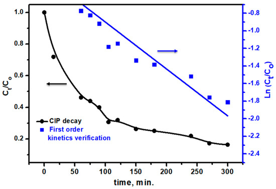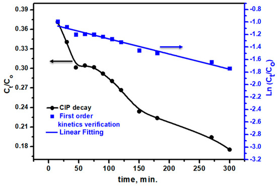 The Co/Ct and first order-kinetics verification of the CIP pollutant degradation at different times from the irradiation of simulated light using the Ag/TiO2 photocatalyst.