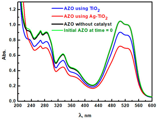 The removal of ACGD in aqueous solutions at different times up to 270 min was studied via UV-visible spectroscopy (Figure 12). ACGD’s characteristic UV-Vis peaks (particularly at 505 nm, 334 nm, and 284 nm) have a progressive decline in absorbance as the reaction time extends up to 270 min. Initially, the minor peak at 334 nm disappeared after 60 min, which indicates the prompt breakdown of specific molecular structures associated with this band. The primary peak at 285 nm has a clear shift to the UV region, which indicated the formed intermediates after ACGD degradation. The main peak at 505 nm has a clear decrease gradually with time progress and is removed after 270 min. Therefore, these findings indicate that Ag/TiO2 is an acceptable photocatalyst for ACGD degradation towards environmental remediation uses.