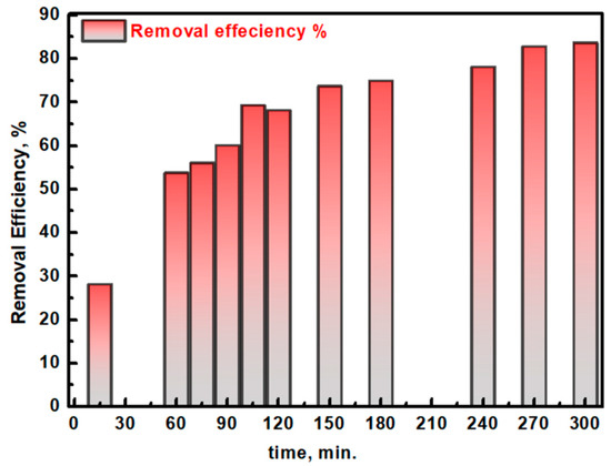 The estimated removal degradation (%) of CIP pollutant at different times from the irradiation of simulated light using the Ag/TiO2 photocatalyst.