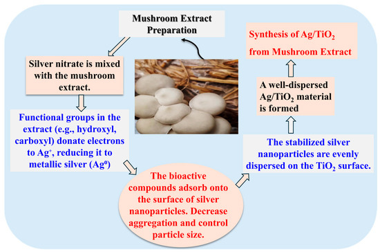 The formation of Ag/TiO2 follows a green synthetic route wherein the mushroom extract serves as both a reducing and capping agent for the silver nanoparticles [44], as shown in Scheme 1. The bioactive compounds present in the mushroom extract such as polysaccharides, proteins, and phenolic compounds could reduce silver ions (Ag+) from silver nitrate into metallic silver (Ag°) through a redox reaction. These bioactive compounds also prevent excessive aggregation of the silver particles by stabilizing them on the TiO2 surface [45]. Therefore, the mushroom extract plays a dual role in the synthesis, facilitating both the reduction of silver ions and the stabilization of the formed nanoparticles. The reduction process occurs when the functional groups in the mushroom extract such as hydroxyl and carboxyl groups donate electrons to the silver ions, which leads to converting them into metallic silver. The mushroom-derived compounds adsorb onto the surface of the silver nanoparticles, acting as a protective barrier to prevent uncontrolled growth and agglomeration. This results in the formation of well-dispersed silver nanoparticles on the TiO2 surface. The interaction between the mushroom-derived stabilizing agents and the TiO2 surface enhances the stability of the Ag/TiO2 material and prevents further particle aggregation. In short, the green synthesis of Ag/TiO2 using mushroom extract as a reducing and stabilizing agent offers an environmental approach to enhance TiO2 characteristics.