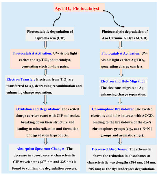 The degradation of azo Carmine G Dye (ACGD) is of critical importance due to its environmental persistence and potential toxicity in aquatic systems. Therefore, Ag-modified TiO2 (Ag/TiO2) was selected as a photocatalyst to enhance the photodegradation of ACGD, given that silver doping is known to improve TiO2’s photocatalytic properties. The photocatalytic activity was assessed using a metal halide lamp, with performance compared against pristine TiO2 under identical irradiation conditions (see Figure 11). The initial absorption spectrum of ACGD, without any photocatalyst, displayed distinct peaks at 284 nm, 334 nm, and 505 nm, with absorbance values of 0.896, 0.613, and 1.0482, respectively, indicating a high concentration of ACGD. These spectral features are likely attributed to specific chromophore groups in the dye structure. Chromophores are parts of a molecule that absorbs UV-visible light due to their conjugated double-bond systems or aromatic rings, causing electronic transitions. For ACGD, the key chromophores are likely to include the azo (−N=N−) groups, aromatic rings, and possibly other conjugated functional groups. Each of these groups has characteristic absorption behaviors in the UV-visible spectrum, which provide many UV-visible peaks for the ACGD aqueous solution. The decline in the absorbance peaks indicates a possible breakdown or structural alteration of these chromophores, thus confirming ACGD degradation. Scheme 2 displays the photodegradation steps. Upon the addition of pure rutile TiO2 as a photocatalyst, the absorbance values at these wavelengths decreased to 0.78, 0.535, and 0.9039, respectively, indicating partial degradation. However, with Ag/TiO2 as the photocatalyst, a more significant reduction in ACGD concentration was seen. The absorbance values further declined to 0.70, 0.45, and 0.72 at 284 nm, 334 nm, and 505 nm, respectively, after 15 min of irradiation, which could suggest enhanced dye degradation (Figure 11). The improved performance of Ag/TiO2 could be attributed to Ag modification, which acts as an electron sink and creates a Schottky barrier at the TiO2 surface, as well as extends TiO2’s light absorption range into the visible spectrum [53,54]. These combined effects underscore the effectiveness of Ag/TiO2 in achieving high ACGD degradation rates.