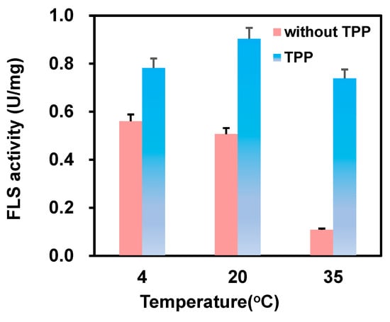 Formolase, a TPP-dependent enzyme, has previously been reported to have lost 50% of enzyme activity at 30 °C for 3 h in TPP-deficient conditions []. Thus, the effect of TPP on immobilization was investigated first. In the absence of TPP, formolase lost around 62% activity after 4 h of incubation, but it could retain more than 81% activity in the presence of 1 mM TPP. Then, we investigated the effect of TPP on the immobilization at 4, 20, and 35 °C. The data in Figure 2 showed that the activity of immobilized formolase in the presence of TPP supplementation was much higher than that without TPP. Especially at 35 °C, the specific activity of the immobilized formolase in the presence of TPP was 6.8 times higher compared to that without TPP in the immobilization. The higher activity of the immobilized enzyme at 20 °C than that at 4 °C could be attributed to the fact that more enzyme was immobilized on the carrier. It is noted that the specific activities of the immobilized formolase in the presence of 1 mM TPP were 0.78, 0.90, and 0.74 U/mg, respectively. However, the activity of the immobilized formolase decreased significantly when the temperature increased from 4 to 35 °C; the specific activities were 0.56, 0.51, and 0.10 U/mg, respectively. The stabilization effect of TPP in the immobilization of formolase could be observed clearly. This could be explained by the fact that the binding of TPP with enzymes can induce the protective effect, preventing the unfavorable reaction between some residues like lysine and the epoxy group on the carriers.