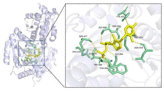 It is known that TPP binds the interface of the conserved pyrophosphate and pyrimidine domains of the TPP-dependent enzymes []. To explain the possible reasons for the stabilization effect of TPP in the immobilization, multiple TPP-dependent enzymes were selected for alignment of the primary sequences. Although the similarity of the TPP-dependent enzymes’ primary sequences is low, the TPP binding domain is highly conserved, including a -GDG-E-NN- sequence, and is located in the random coil area of the joint sequence linking the alpha helix and beta sheet. It could be deduced that the TPP in the binding domain could stabilize the spatial structure of the TPP-dependent enzymes. To further prove this point, molecular docking of TPP-dependent formolase was performed as shown in Figure 3. Also, it can be seen that the TPP domain is located inside the enzyme molecules and links the alpha helix and beta sheet, playing a significant role in maintaining the structure and enhancing the rigidity of the enzyme. The thiazole ring at the end of TPP can form hydrogen bonds with the residues Asn419, Met421, and Tyr453 of formolase. These hydrogen bonds help to maintain the spatial structure of formolase, thus playing an enhanced stabilization role in the immobilization of formolase.