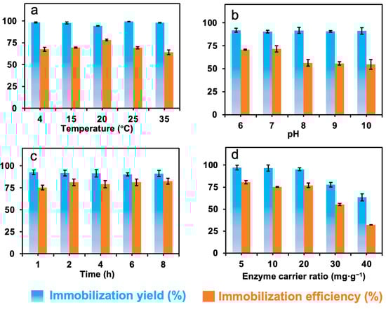 The effects of (a) temperature, (b) pH, and (c) immobilization time, and (d) the enzyme–carrier ratio on the immobilization of formolase.