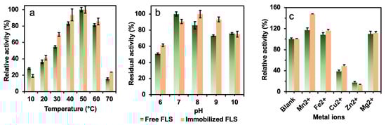 The effects of (a) temperature, (b) pH, and (c) metal ions on the relative activities of free and immobilized FLS.