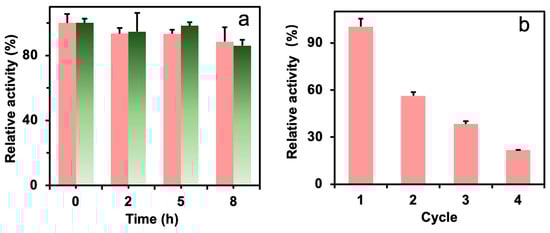 The effect of enzyme-to-support ratio on the immobilization is shown in Figure 4d. When the amount of enzyme is excessive, enzyme molecules might bind on the surface of the support by crowding together, or some enzyme molecules might not be able to approach carriers, leading to a high mass transfer resistance to substrate molecules in the catalytic reaction []. While the amount of enzyme is insufficient for the support, the immobilization yield will be high because most of the protein can be immobilized. But the specific activity may be low because the enzyme is not enough for the immobilization. It is difficult to find a suitable ratio of enzyme to carrier []. When the ratio of enzyme to carrier was 20 mg g−1, the immobilized efficiency was 77%, while the immobilization yield was as high as 95%.