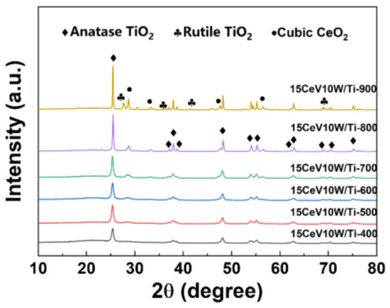 The effect of calcination temperature on 15CeV10W/Ti catalysts was explored. Figure 1 displays the XRD patterns for the 15CeV10W/Ti-X catalysts calcined at 400–900 °C. All catalysts, except for the one calcined at 900 °C, exhibited diffraction peaks corresponding to anatase TiO2 (PDF#21-1272) [17]. The intensity of these peaks increased with higher calcination temperatures, indicating enhanced crystallinity. Additionally, the grain size grew as the calcination temperature increased, as observed in the SEM images (Figure S1). When calcined at 900 °C, characteristic peaks associated with the rutile phase (PDF#21-1276) appeared [18], along with a further increase in diffraction peak intensity, signifying a phase transition and potential partial sintering of TiO2. This transition may lead to the agglomeration of active species, as evidenced by the detection of CeO2 diffraction peaks (PDF#34-0394) [19] in the sample calcined at 900 °C. In traditional VW/Ti catalysts, the phase transition from anatase to rutile typically occurred between 600 and 700 °C, while the Ce-doped VW/Ti catalysts only showed this transition at 900 °C, indicating that Ce-doping enhanced the thermal stability of vanadium-based catalysts. The XRD patterns did not reveal any peaks for V2O5 and WO3 species, likely due to their low concentrations or because these species were highly dispersed, existing in amorphous or nano-crystalline forms on the anatase TiO2 surface [18].