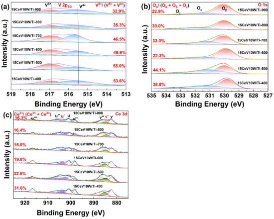 XPS analyses were conducted to assess the impact of calcination temperature on the 15CeV10W/Ti catalysts. As shown in Figure 3a, the V 2p3/2 XPS spectra of 15CeV10W/Ti-X catalysts could be deconvoluted into two peaks at 516.8 eV and 515.5 eV, corresponding to V5+ and V4+ species, respectively. The ratio of V5+ to the total vanadium (V5+/ (V5+ + V4+)) was calculated based on the area of these peaks (Figure 3a). The 15CeV10W/Ti-500 catalyst exhibited the highest V5+/ (V5+ + V4+) ratio at 55.0%, which significantly decreased with increasing calcination temperature. This higher ratio may be attributed to a reduction in the vanadium content in the crystalline grains and the displacement of adjacent oxygen atoms, facilitating the formation of active adsorbed oxygen species [23]. Previous studies indicated that V5+ species were the key active sites in the NH3-SCR reaction, suggesting that a higher V5+/(V5+ + V4+) ratio correlated with improved SCR activity.