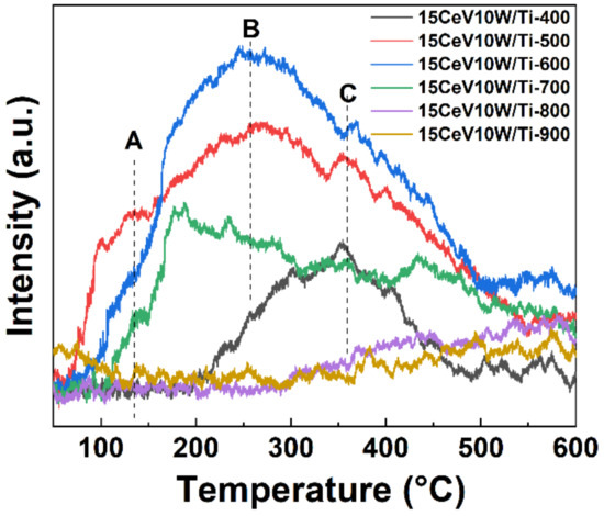 V5+ + Ce3+, thereby enhancing the NH3-SCR activity [23].As illustrated in Figure 4, the NH3-TPD profiles for the 15CeV10W/Ti-X catalysts exhibited a broad temperature range, indicating the presence of various acid sites with differing strengths. The desorption peaks of NH3 below 100 °C (Peak A) were attributed to physically adsorbed NH3, while the peaks in the 100–250 °C range (Peak B) primarily arose from chemisorbed NH3 on weakly acidic sites. The NH3 desorbed between 250 and 400 °C (Peak C) was mainly from strongly Brønsted acidic sites [28]. When the calcination temperature exceeded 700 °C, the NH3 desorption peak diminished significantly, suggesting a reduction in acidic sites. In comparison, the 15CeV10W/Ti-500 catalyst, calcined at 500 °C, exhibited the lowest desorption peak temperature, indicating its superior activation capability for NH3. Furthermore, the 15CeV10W/Ti-500 catalyst demonstrated a higher overall NH3 desorption, indicating a rich and balanced distribution of acidic sites, which contributed to its superior catalytic activity.